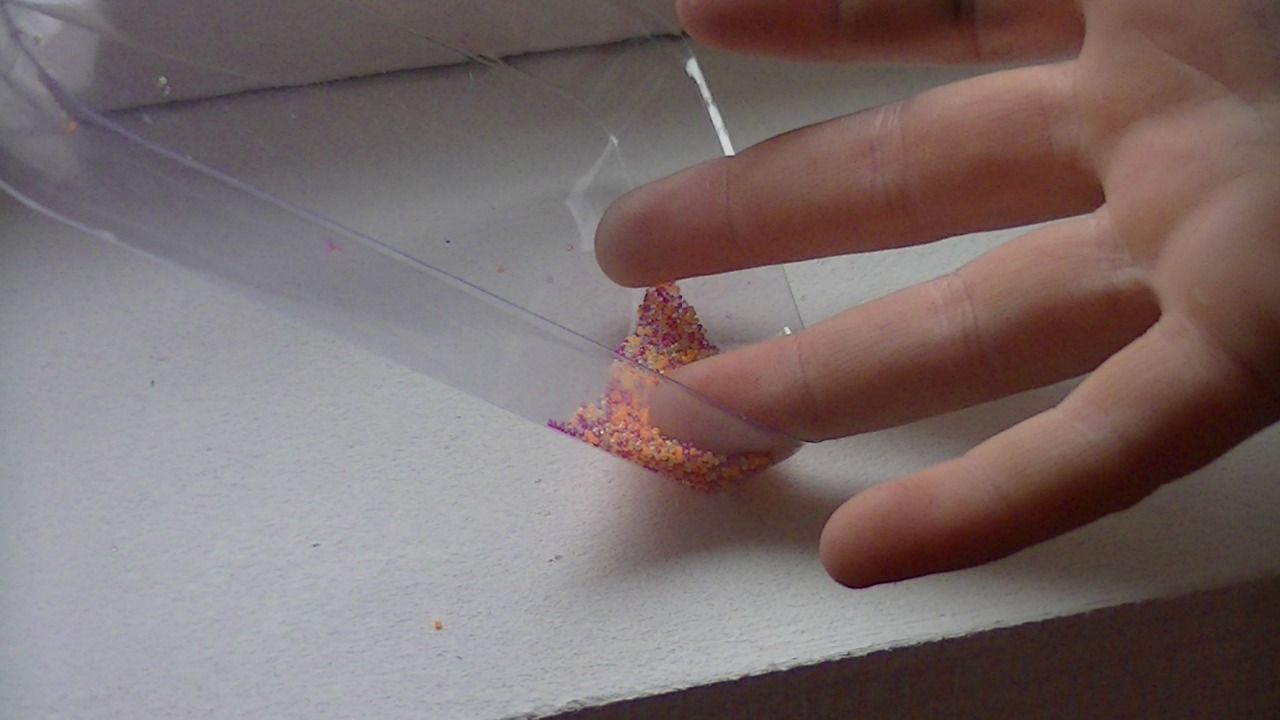Dan doop je je vinger erin, met een nog natte nagel zo blijven de pareltjes plakken!