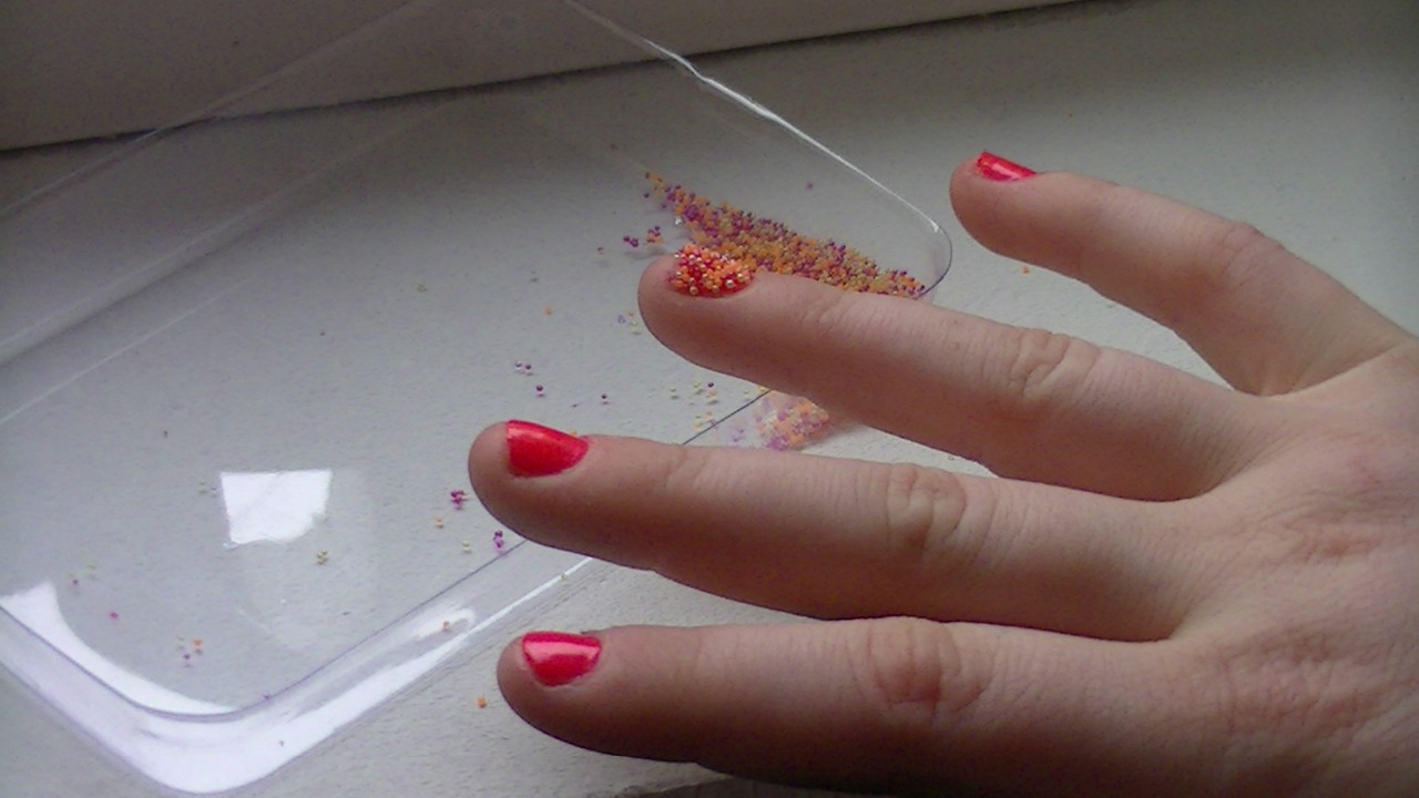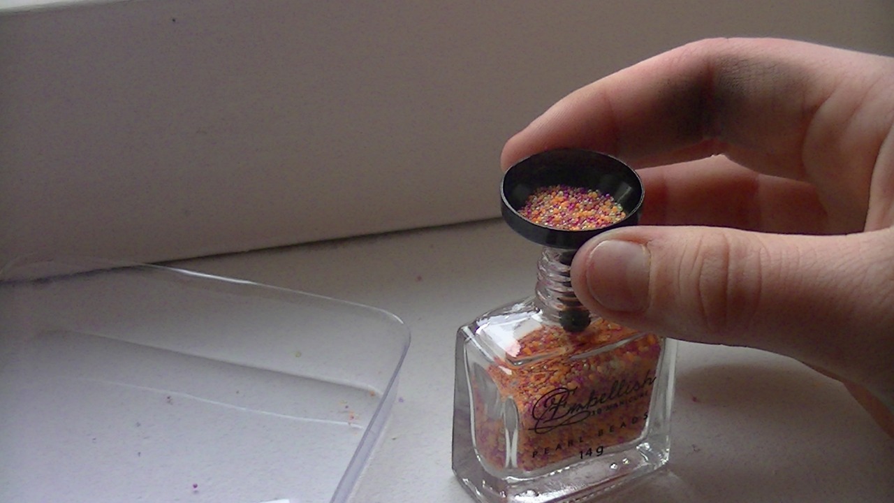 een soort topcoat, dat zeefje is voor de overige pareltjes die je in het bakje hebt zitten!